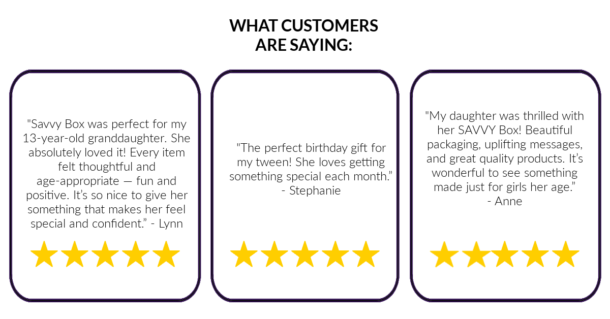 SAVVY empowers girls ages 7 to 17 to embrace their individuality, build confidence, and express their creativity through curated lifestyle subscription boxes filled with fun, inspiring, and age-appropriate products. We believe in celebrating girlhood with purpose, positivity, and a bold sense of self.